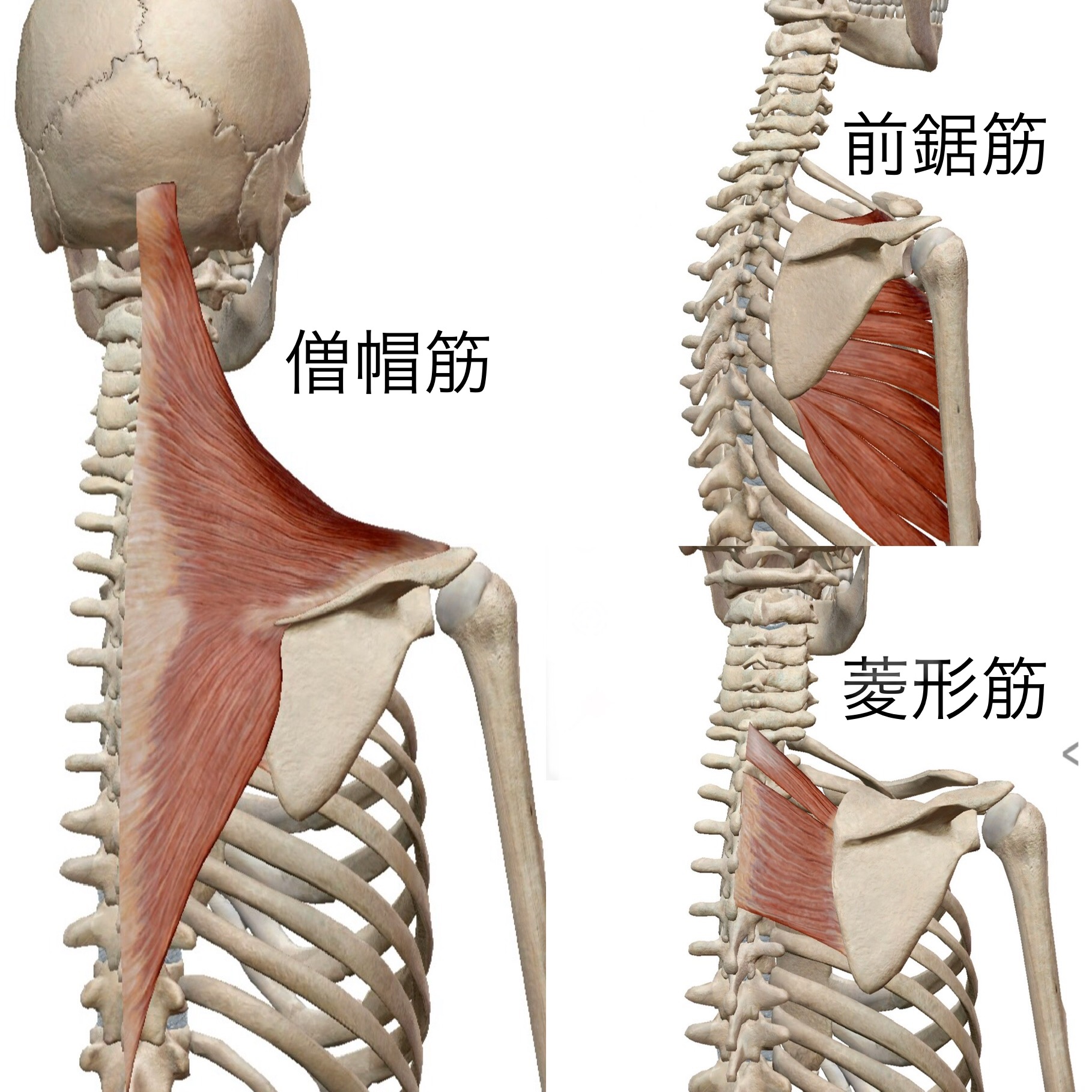 僧帽筋は、上部、中部、下部に分けられ、背骨と肩甲骨をつなぐ大きな筋肉です。