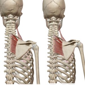 菱形筋は、僧帽筋の内側にあり、背骨と肩甲骨をつなぐ筋肉です。