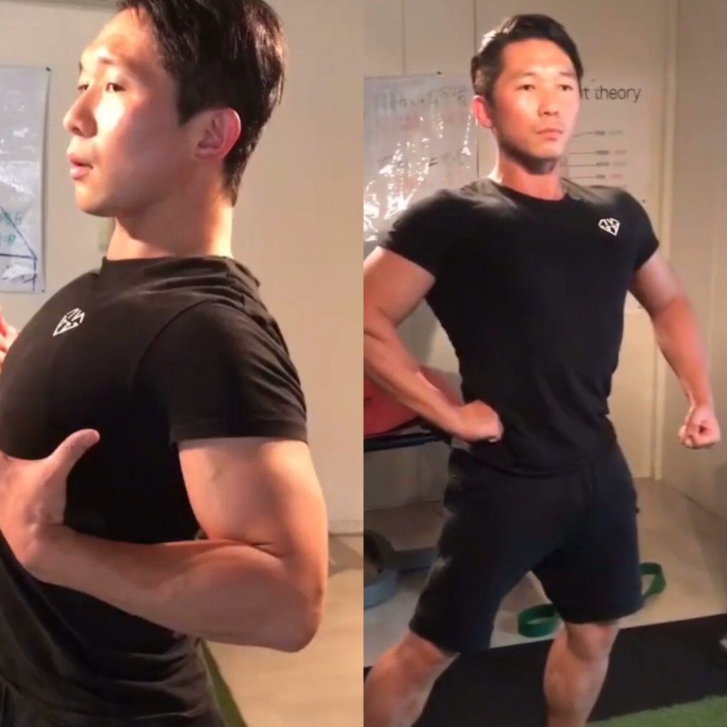 つまり、ベンチプレスのネガティブ動作のときの状態のように胸椎を伸展させ胸は張らせて緊張させておくほうが、ボディラインをよく見せることができます。